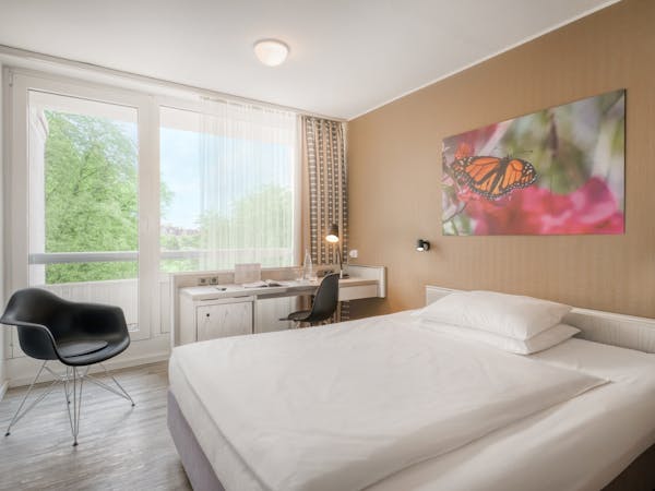 Our Standard double rooms with double bed have a high-quality bed, a television, a telephone and a functional workstation with free WIFI. Unlimited free mineral water is available in our snack store. (bed size 0.90 × 2.00 m per mattress) - The room pictures shown are exemplary and non-binding for the hotel.
